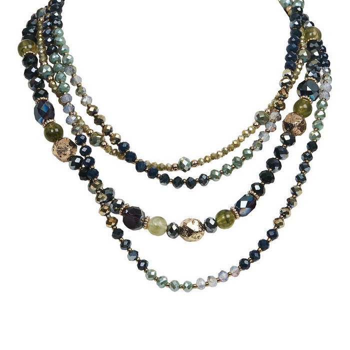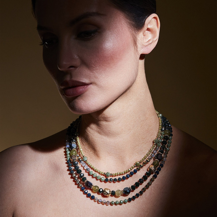 Ett fyrradigt halsband i gröna och blå toner, från Moshi.