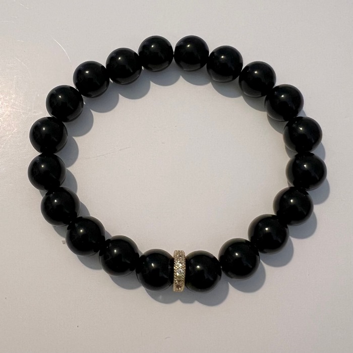 Ett svart armband med svarta stenar, Svart Emporer, och detalj i guldpläterad mässing och gnistrande glaskristaller.