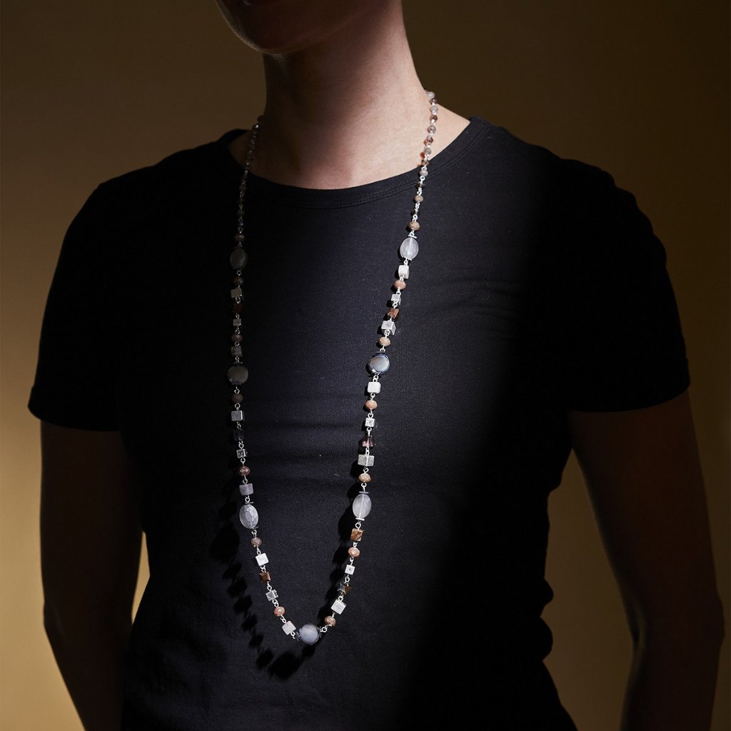 Ett långt halsband i beige-silvriga toner, från Moshi. Superfint att ha två varv. Ett varv blir väldigt långt till vissa outfits, mät gärna upp ett snöre om du är osäker 🤗