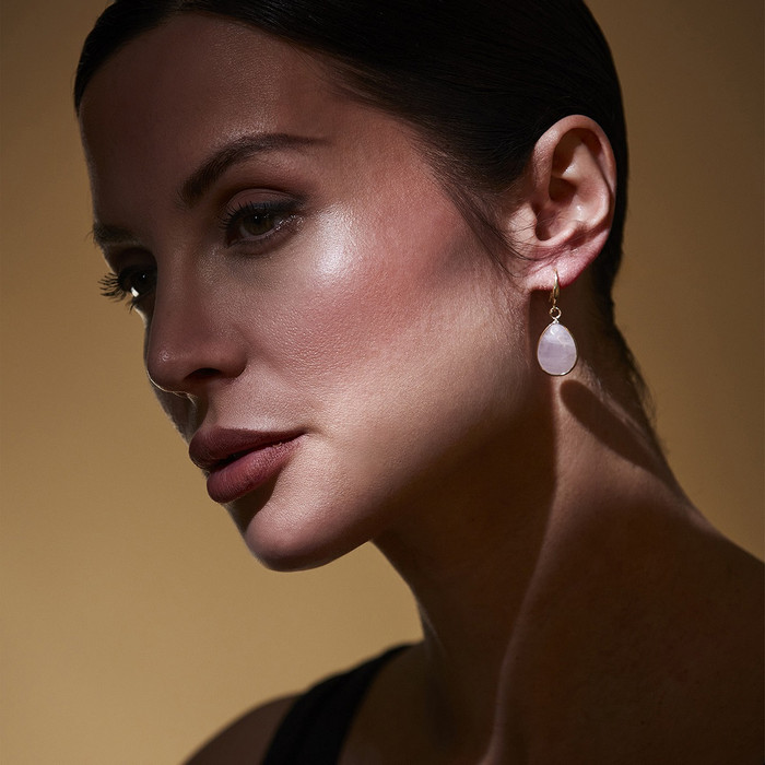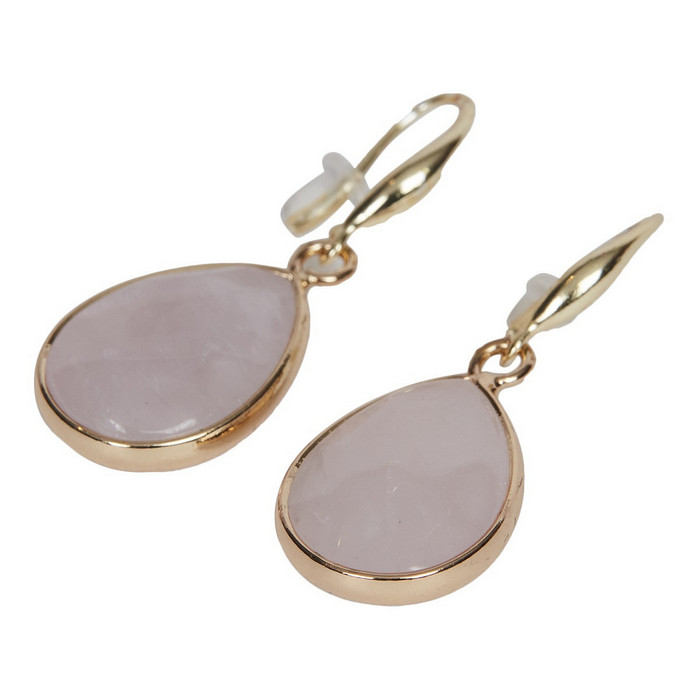 Ett par söta, droppformade örhängen med Rosenkvarts och guldpläterad mässing.