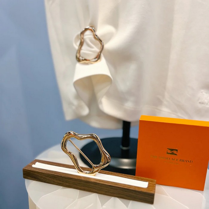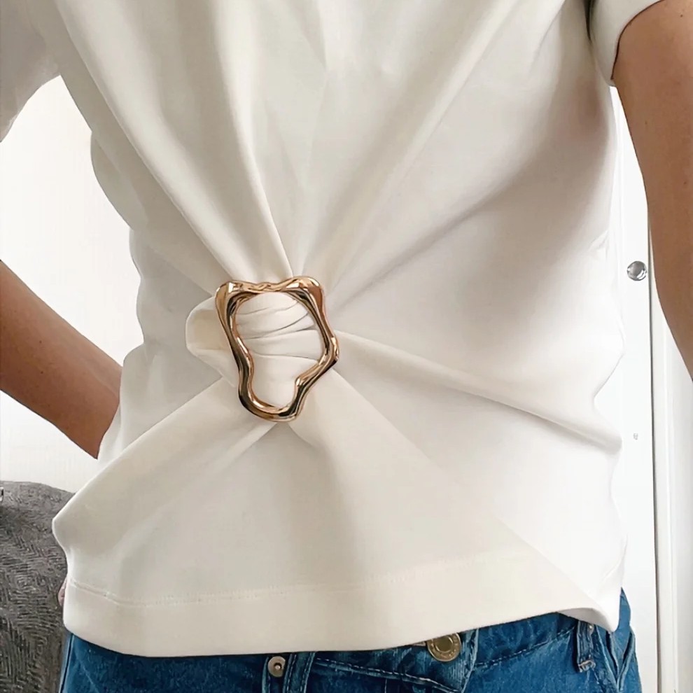 Decor Bucle – Universal Gold är ett asymmetriskt, ovalt spänne i guldfinish som låter dig skapa form, drapering och midja – utan att sy eller förändra plagget permanent.
