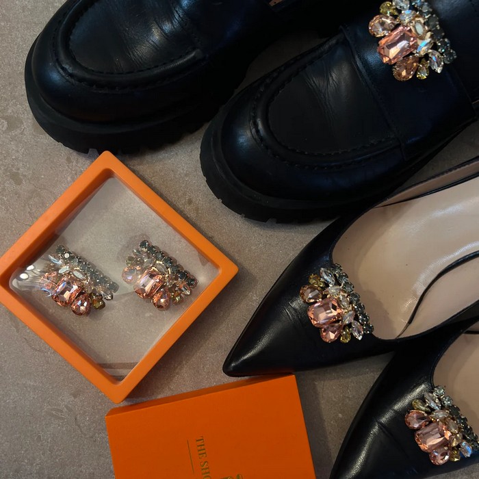 Ett färgsprakande och elegant skosmycke i multicolor kristaller. Designen består av ett gnistrande kluster av stenar som omedelbart ger dina skor – eller din väska – en livfull och lyxig känsla.