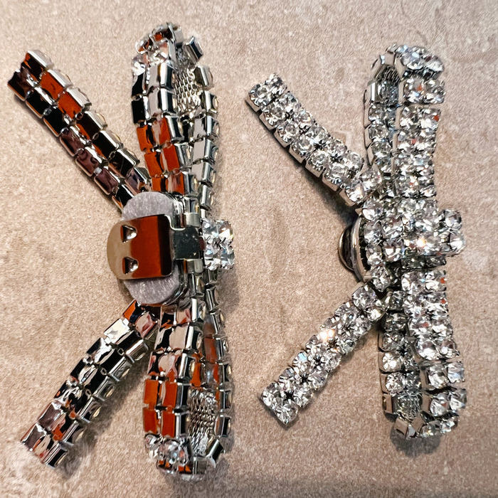 På baksidan sitter två smidiga skoklipps-spännen som enkelt nyper fast skosmycket på pumps, loafers, sandaler, sneakers – eller varför inte på väskremmen för en glamorös detalj?
