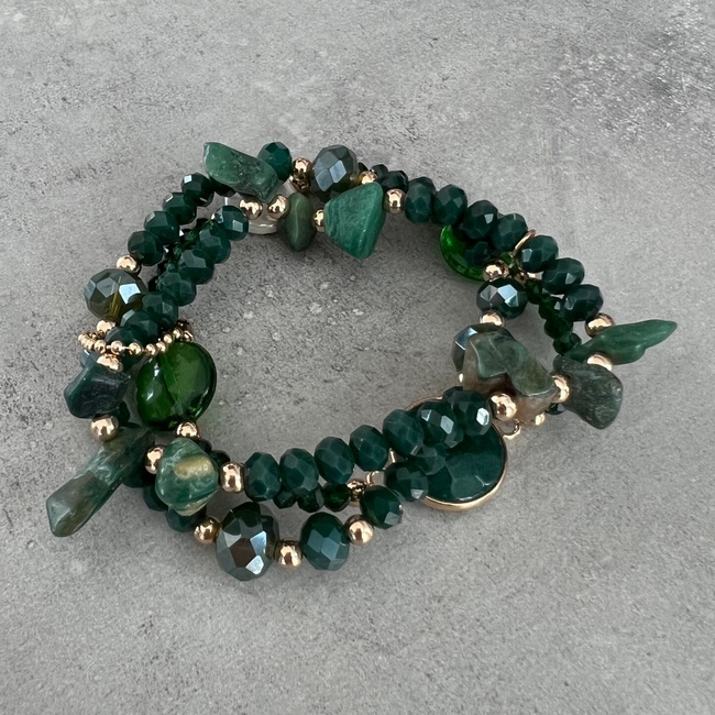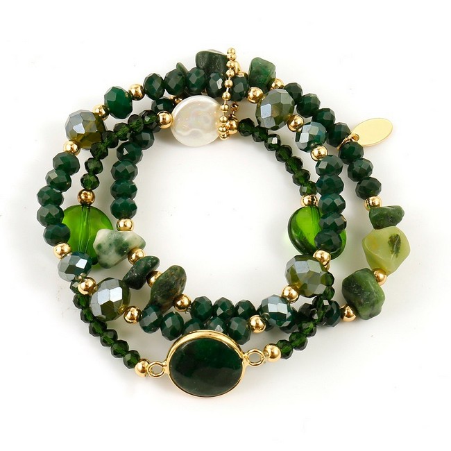 Ett strechigt, treradigt armband i gröna toner. De tre armbanden sitter ihop en en dekorativ, guldfärgad, oval bollring.