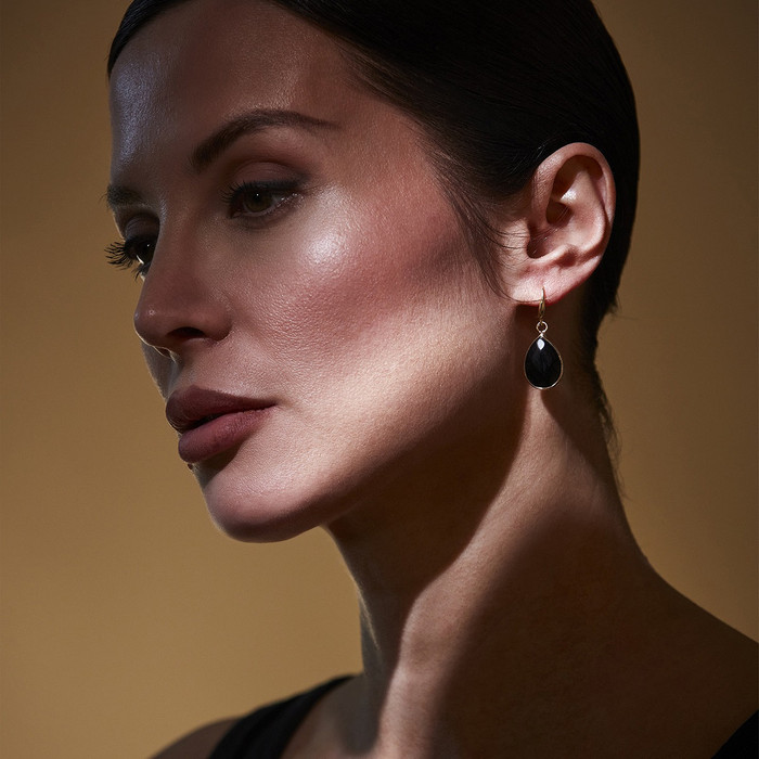 Ett par söta, droppformade örhängen med svart sten (Black Emperor) och guldpläterad mässing.