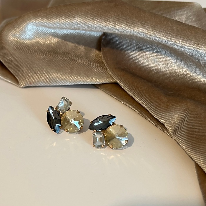 Ett par gnistrande studs i grått, beige och klart, med detaljer i guldpläterad mässing.