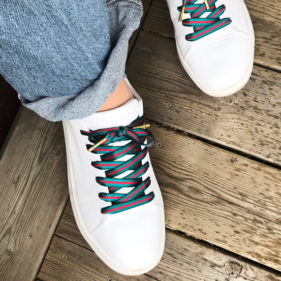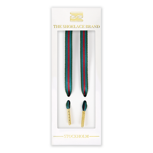 Classy Stripe skosnören från The Shoelace Brand är ett lyxigt skosnöre som går i grönt/rött/blått. Den guldiga metall-tippen ger skobandet en lyxigt look.